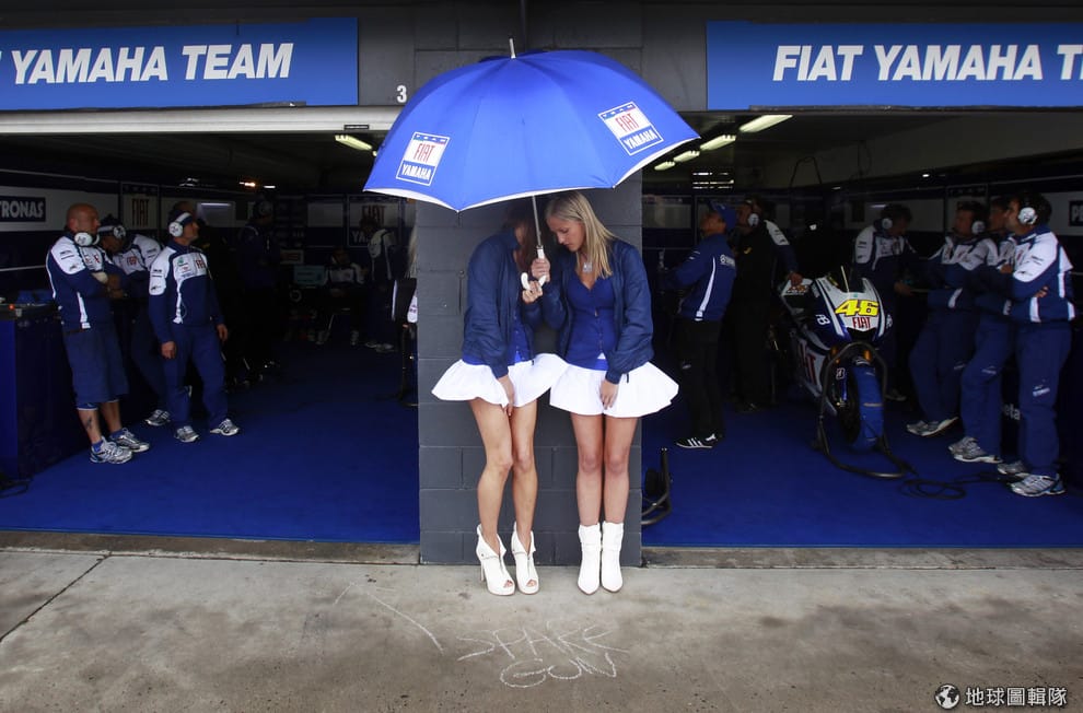 2010年在澳洲墨爾本大獎賽上,賽車女郎撐著大陽傘躲到車隊的車棚避雨。