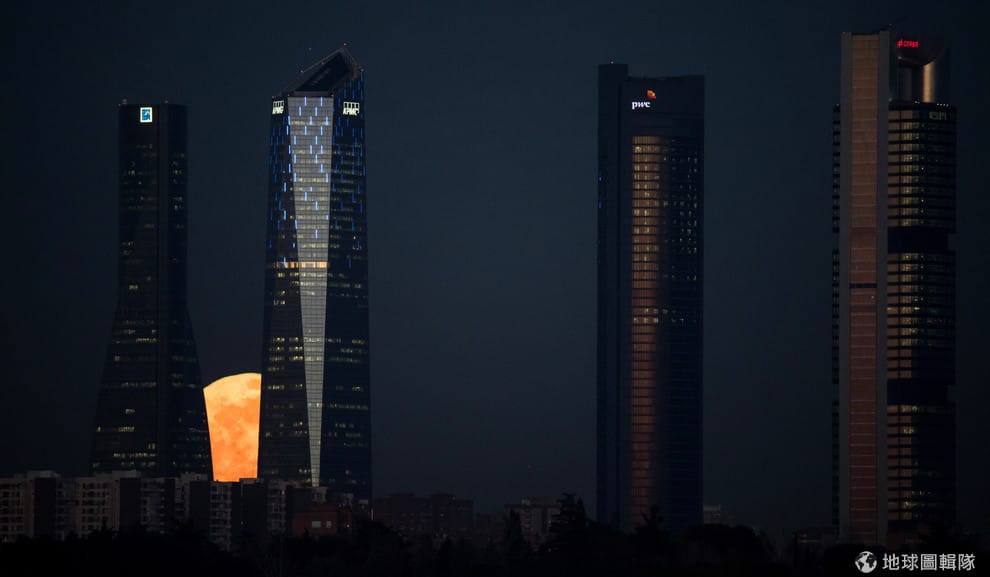 在西班牙馬德里,月亮剛從地平線升起,穿梭在建築物間的畫面格外有「猶抱琵琶半遮面」的趣味感。