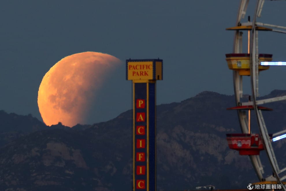 路透社在美國加州的聖莫尼卡碼頭,「消失」到一半的月亮與遠方的摩天輪相互映照著。
