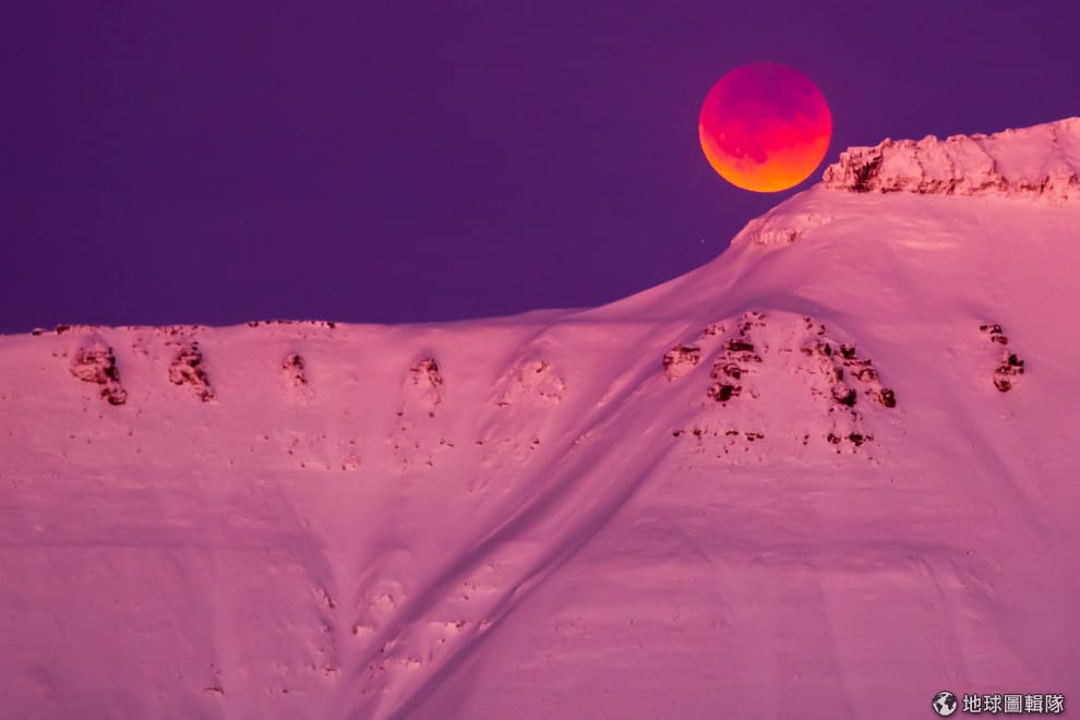 路透社在挪威隆雅市的山脈,不一樣的天光也讓月亮的色彩顯得特別不一樣。