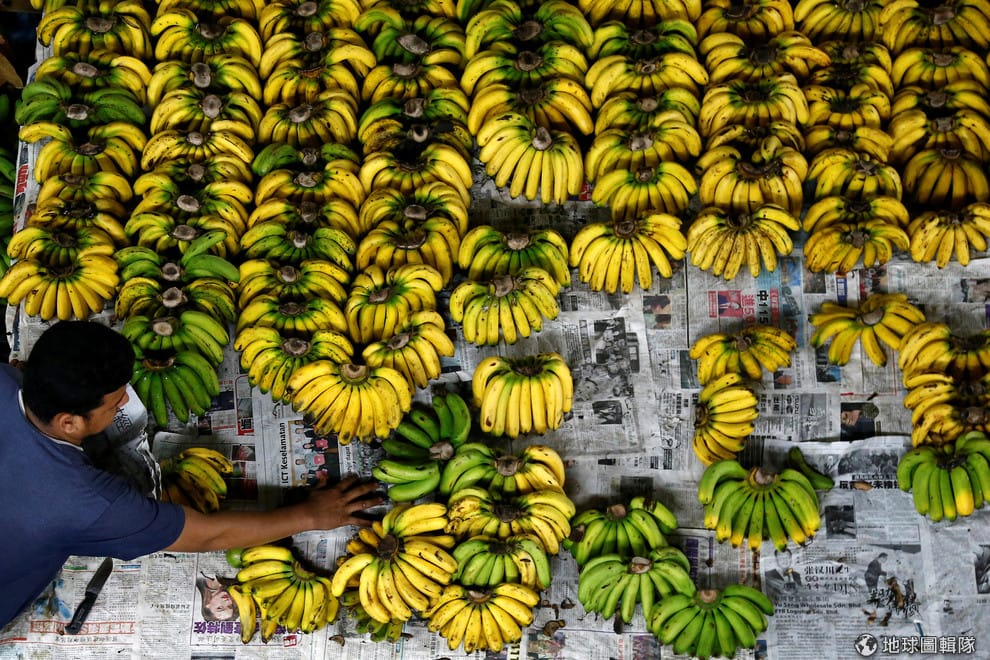 一名馬來西亞的蕉農正在整理放在地上的香蕉。日本有 99%的香蕉都靠進口。