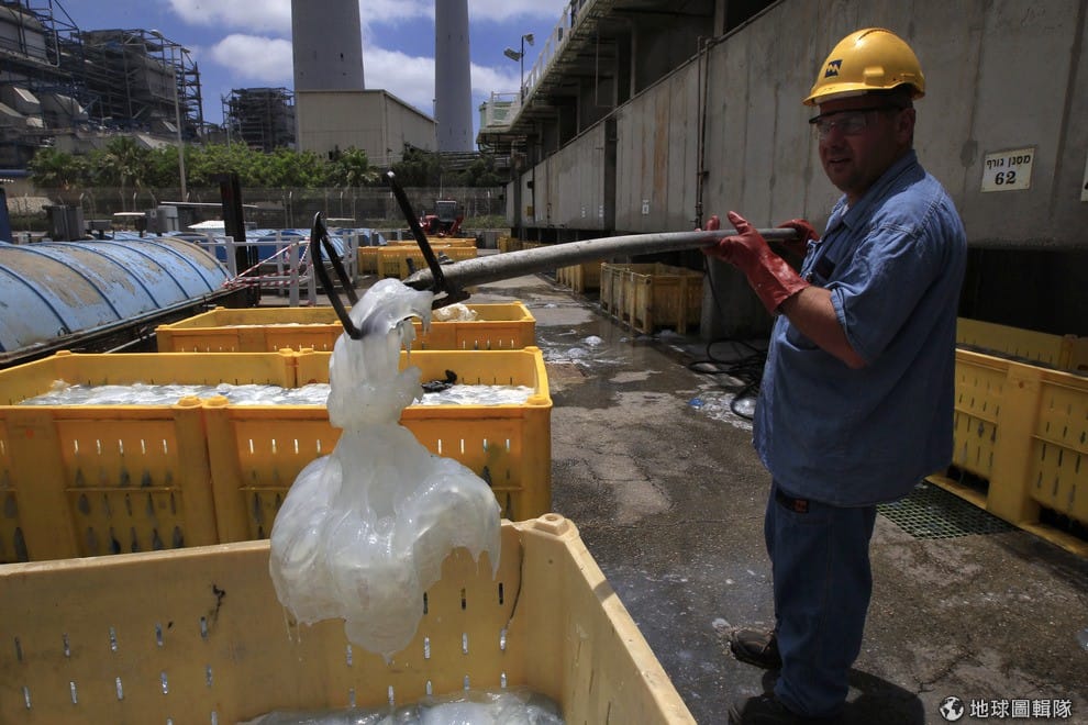 照片中是以色列發電廠員工,他正在清除堵住廠房進水口的水母