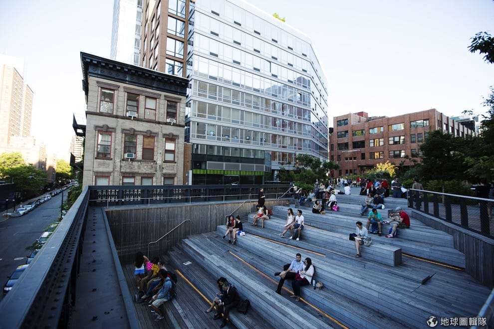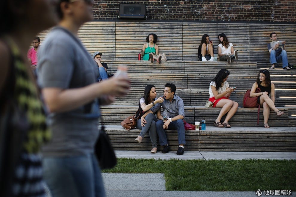 紐約市內的高架公園(The High Line Park)內,三五成群的人們在難得安靜的市區角落談心納涼。