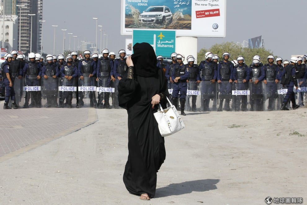 在巴林,一名穿著阿巴雅長袍的女子站在警察面前。