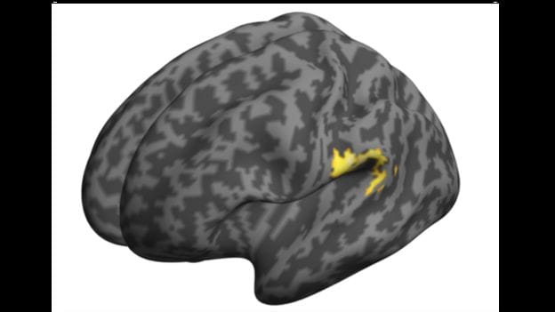 在罹患思覺失調症患者的大腦中,大腦皮質裡有關聽覺的部分(黃色處)特別敏感。