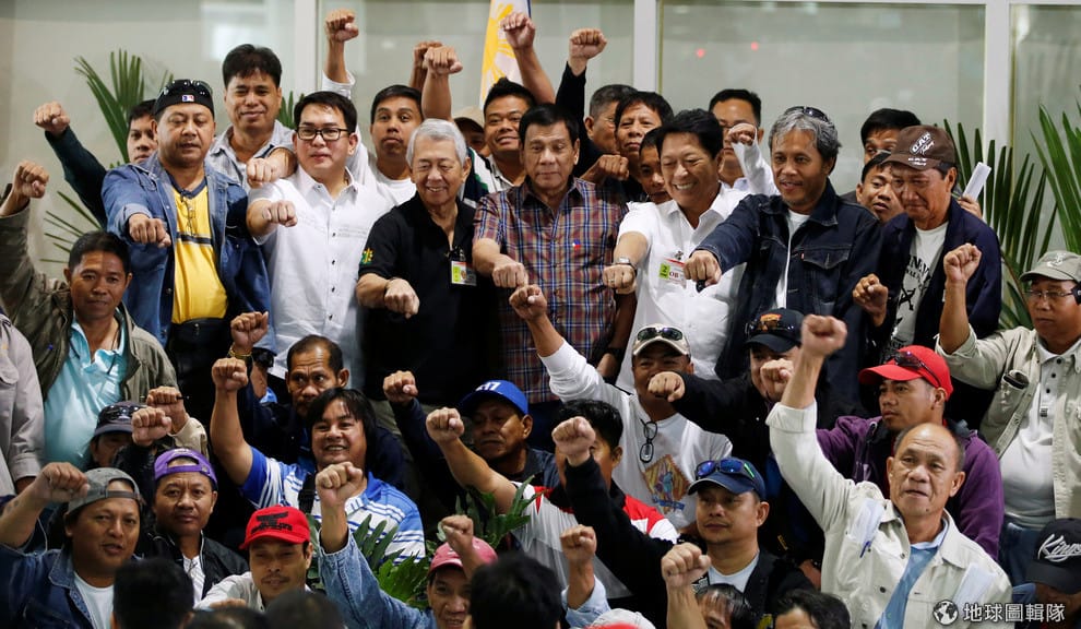 有不少菲律賓人選擇出國工作,圖為 2016年 8月飛回菲律賓馬尼拉的尼諾伊·艾奎諾國際機場(Ninoy Aquino International Airport)的菲律賓移工們和總統杜特蒂的合影。