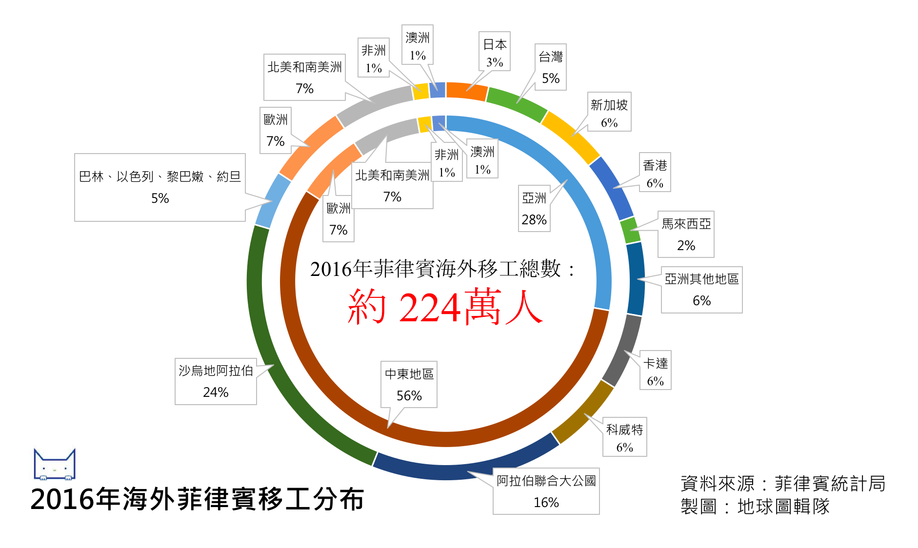 從圖表中可以看到,2016年最多菲律賓移工跑到中東地區工作。此外,該年有 5%的菲律賓移工來台工作。