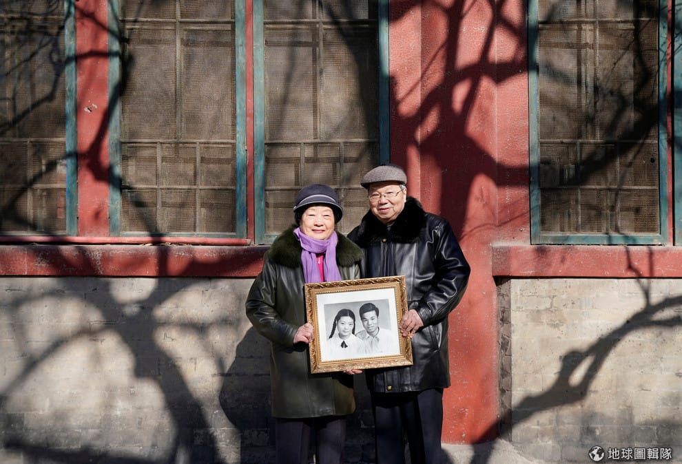 83歲的黃福生(音譯,Huang Fusheng)和 80歲的唐蘭芳(音譯,Tang Lanfang)手上拿的是他們在 1958年拍攝的結婚照片,他們當年都在古蹟恭王府工作,並在主管的介紹下認識。