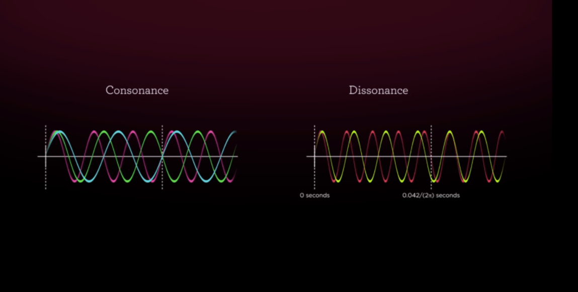 △ 將相同音型的D大調三和弦(D、F﹟、A)拉出來檢視,從上列數學程式中可以得出三顆音符的正弦波,其組合出來的動聽和弦稱為「協和音程」。而這種計算方式也讓我們可以看見貝多芬的「腦內圖像」。