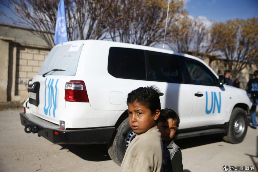 本月 14號,聯合國的車輛開進東烏塔區,兩名孩子看著前來當地的救援人員。