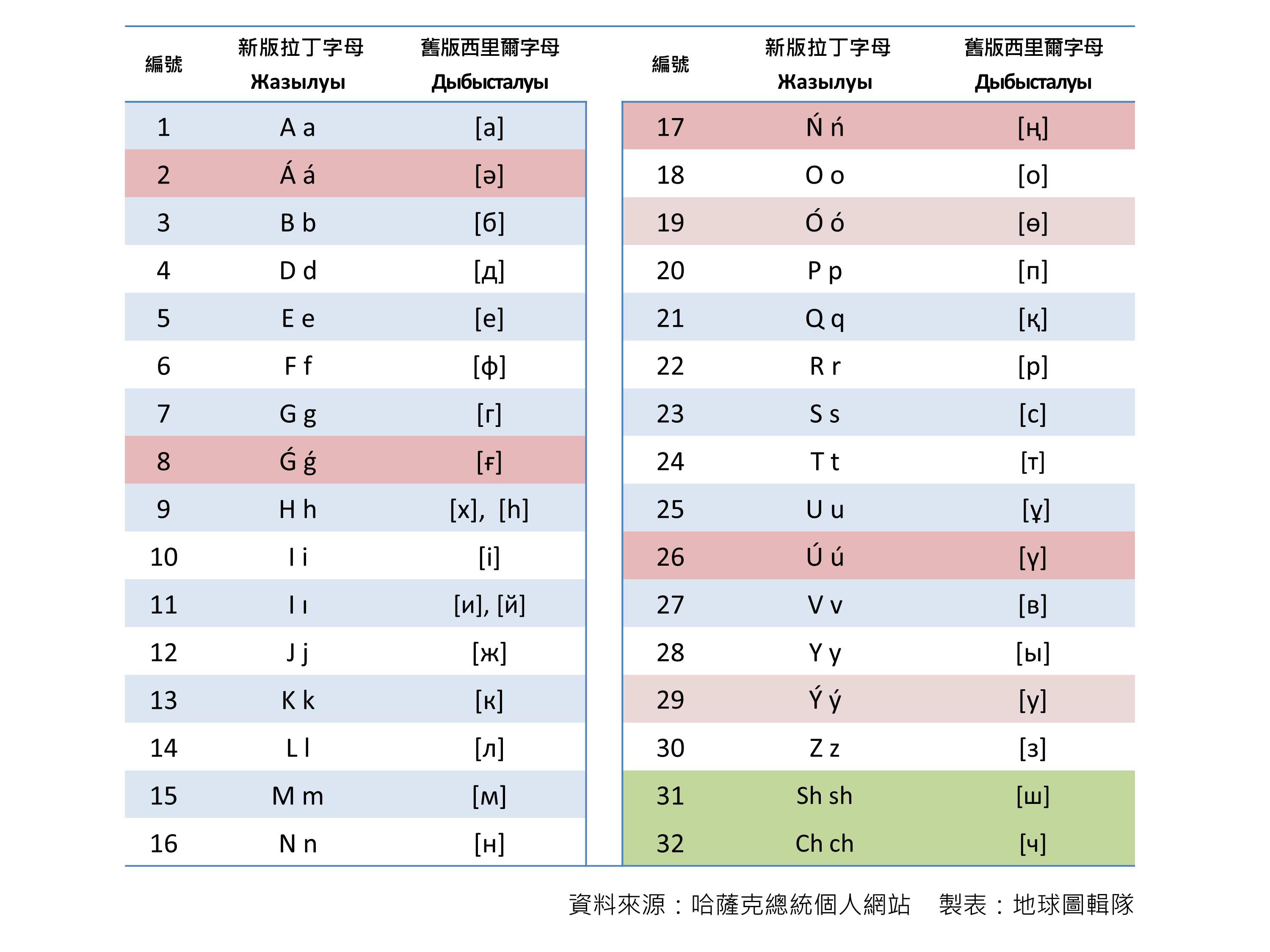 這是昨天哈薩克總統公布的最新版拼音文字對照表,左邊是新制以拉丁字母為基礎的拼音文字,右邊為舊制西里爾字母。表上以紅底標示的欄位為「加入撇號」的哈薩克字母,綠底為修正過字母排序和寫法的sh和ch。