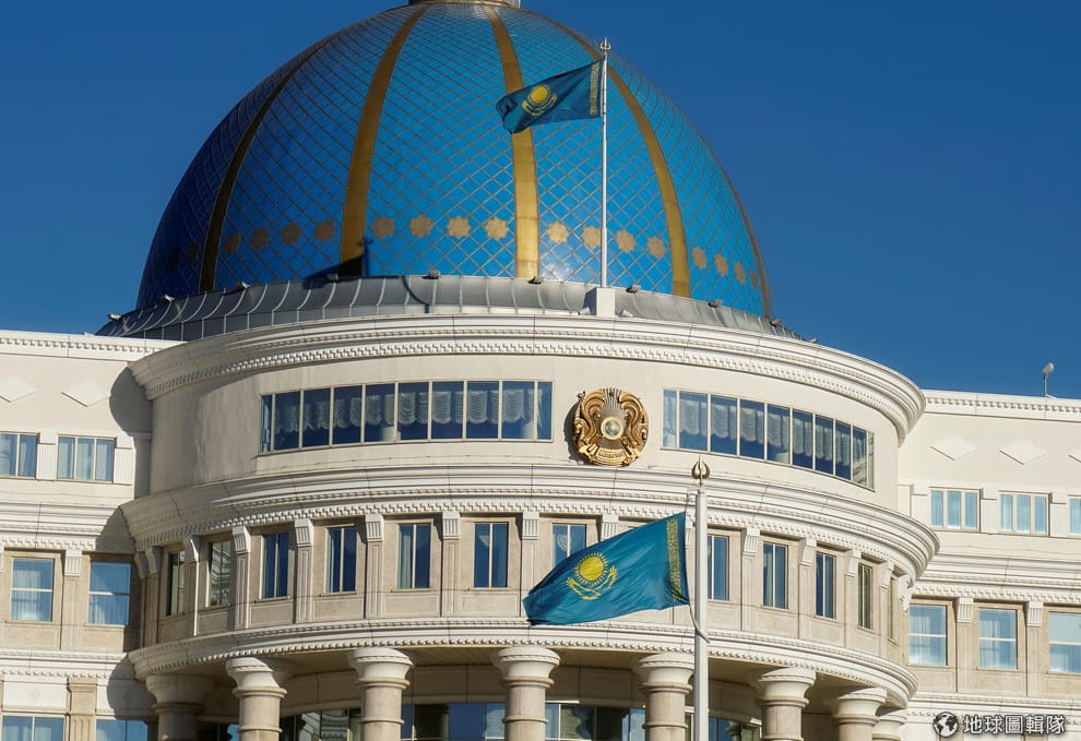 圖為位於哈薩克首都阿斯塔納(Astana)的阿斯塔納奧爾達宮(Ak Orda)和哈薩克國旗。1991年蘇聯解體,哈薩克是當時蘇聯加盟國當中最後一個宣布獨立的國家。
