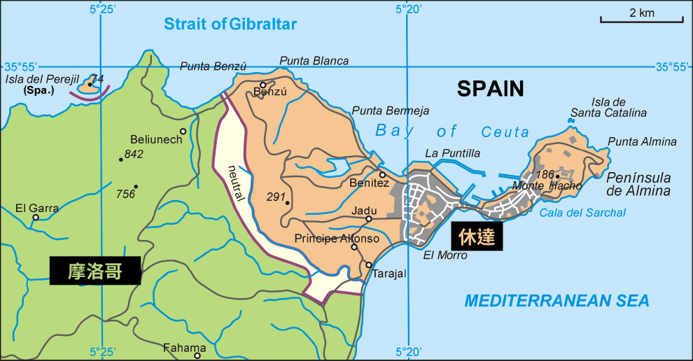 圖中橘紅色的地方就是西班牙飛地休達,休達就位在北非的摩洛哥境內,和伊比利半島之間隔著直布羅陀海峽。