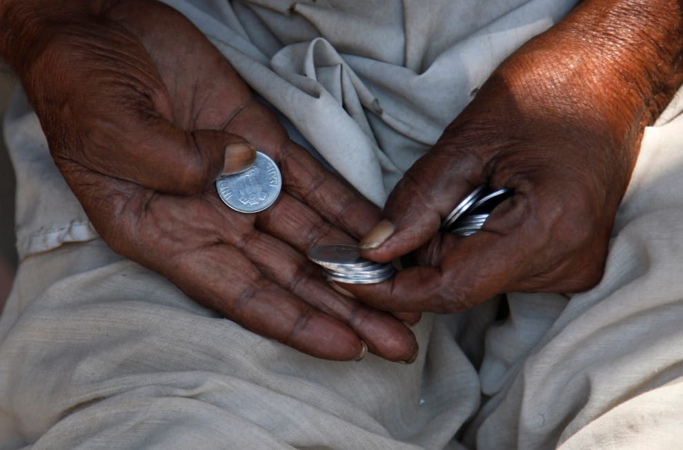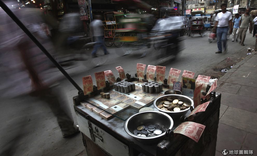 在印度德里(Delhi)街頭, 人們走過換匯小販充滿紙鈔和硬幣的攤子。雖然政府不斷保證十元盧比硬幣沒問題,但仍有許多民眾不相信。