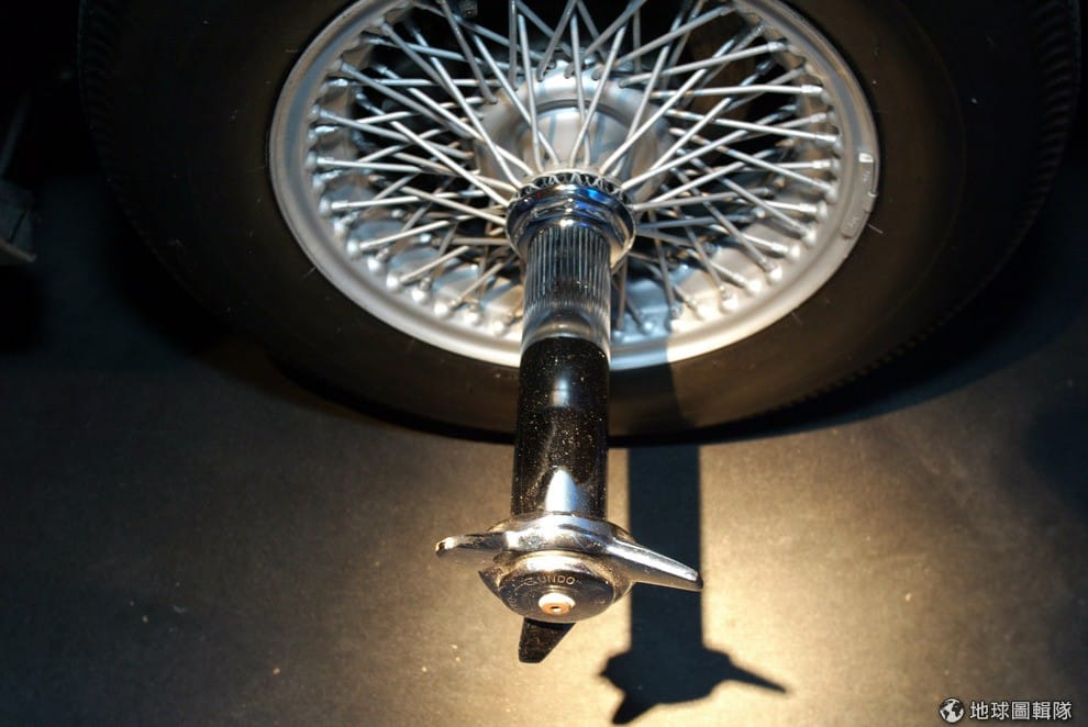 Aston Martin DB5車上配有許多驚奇的間諜裝備,像是照片中專門擊退敵人的銳利刀刃就是經典的配備之一,龐德遇上難纏的敵手時,就能利用輪胎伸出的刀刃戳破對手輪胎,趁機脫逃。
