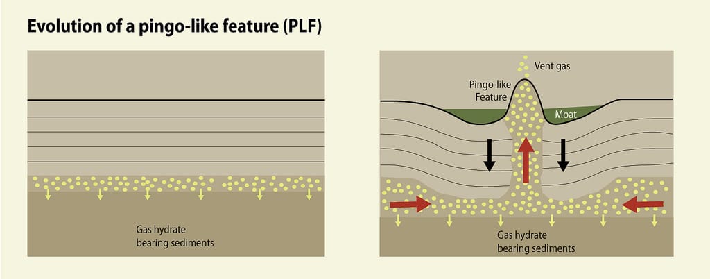 而這些在甲烷冰層的裂縫變成了底下流體的通道,讓壓力可以釋放、轉移到甲烷冰層上的沉積層上。就會使得甲烷冰層之上的沉積層鬆動、坍方。
