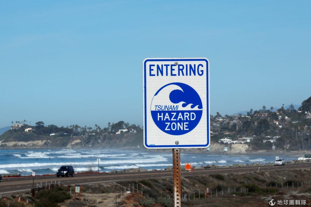 科學家們猜測,如果海床的甲烷冰可以讓地盤更穩固,那個地方就不容易引發海嘯。圖為 2018年在美國加州高速公路旁的海嘯注意標誌。