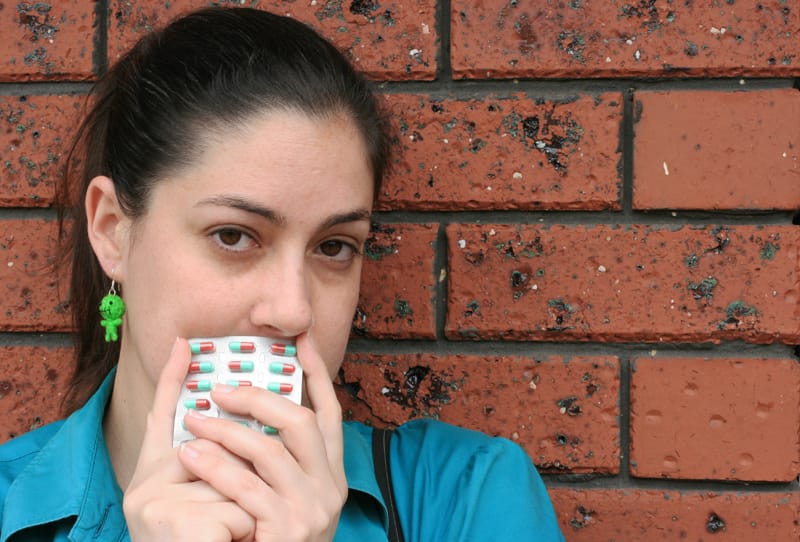 一名女子正在服用抗憂鬱藥物氟西汀(Fluoxetine),商品名為百憂解(Prozac)。過去,服用抗憂鬱藥物往往被貼上負面標籤,加劇患者的羞恥感。
