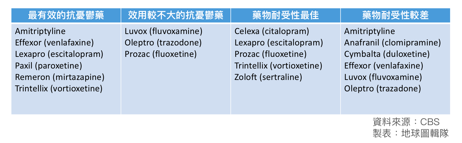 最近,一份發表在《刺胳針》醫學期刊的國際研究顯示,抗憂鬱藥真的有用,能治療服用者憂鬱的症狀。此外,有的抗憂鬱藥比其他種類的抗憂鬱藥更有效,而且耐受性更佳。