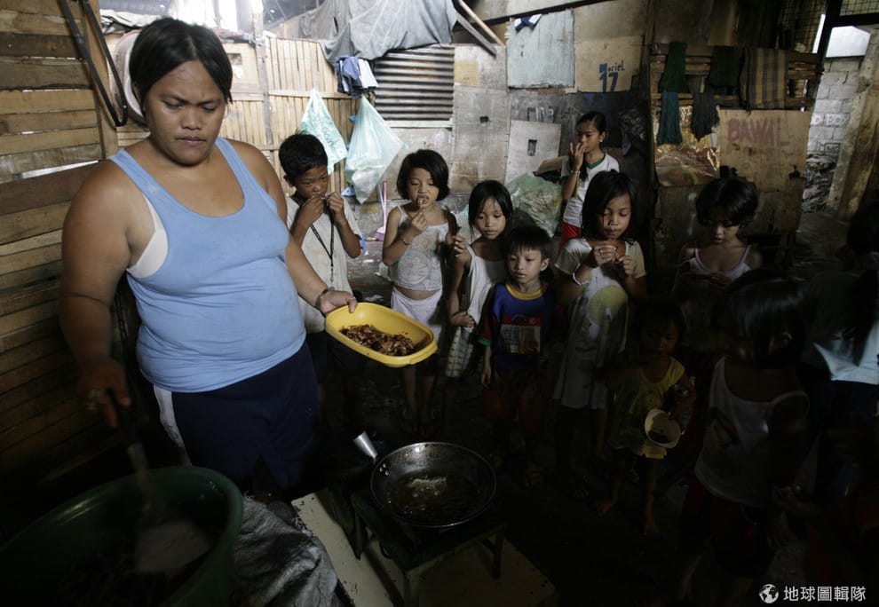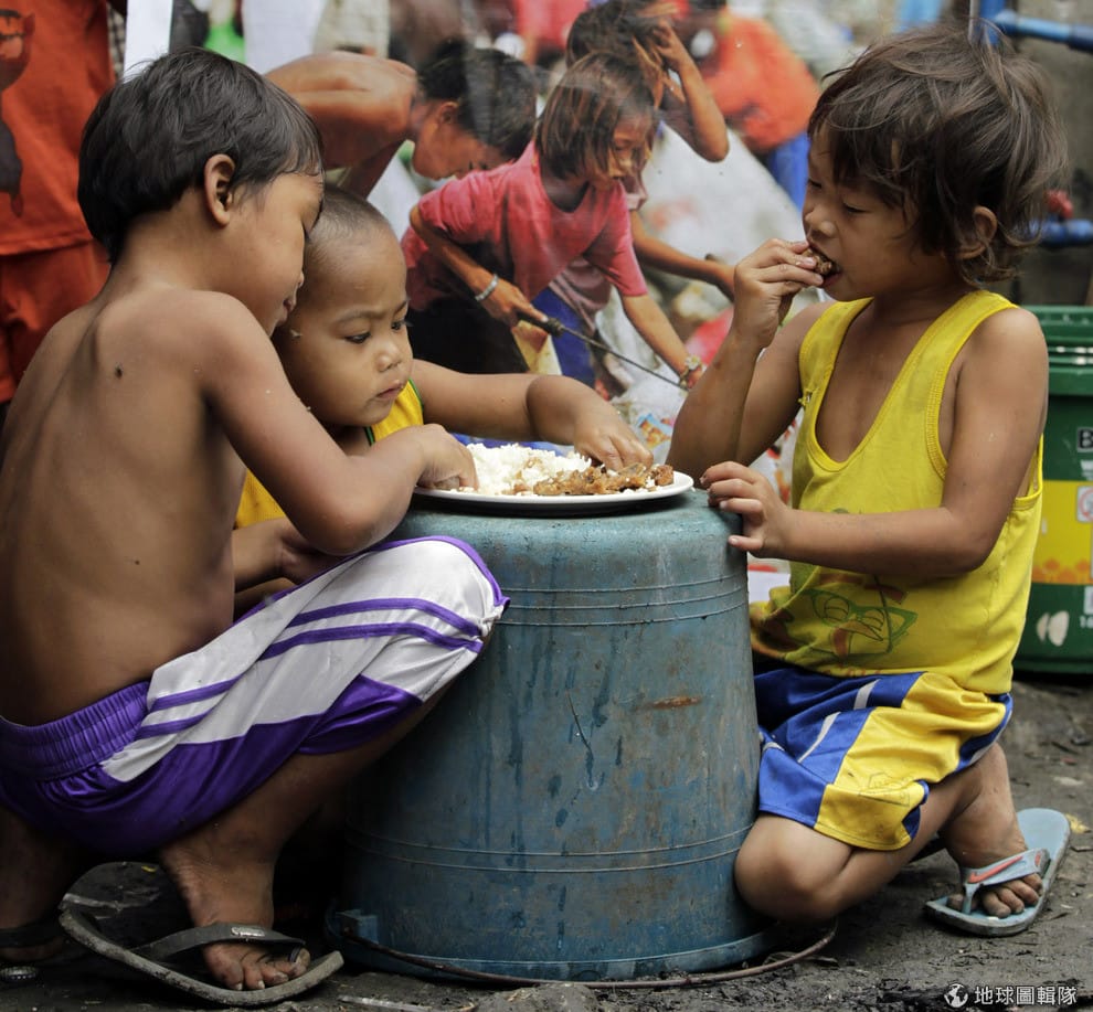 在菲律賓馬尼拉中部的貧民窟,一群小孩正聚在一塊吃「pagpag」。