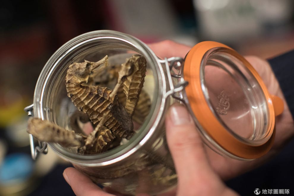 罐子裡全部都是乾掉的海馬。在中藥裡,乾海馬擁有治療陽痿、癌症等各式各樣的功效。
