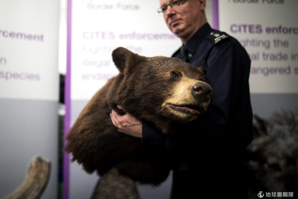一名海關手上拿著棕熊的標本,他說這是在托運行李中找到的。