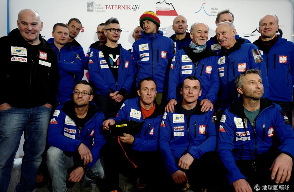 畫面中是紐博克(前排中)和團隊成員的合照,一共有 17人參與這次的K2攻頂。