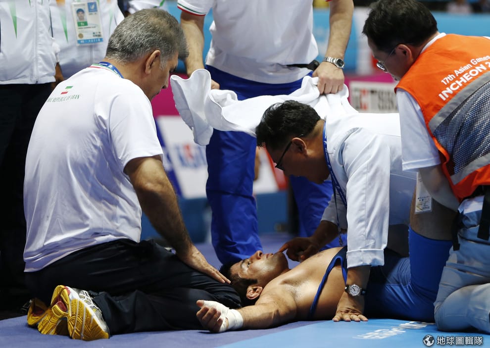 伊朗摔角選手阿布德瓦利(Saeid Abdvali)躺在地上,接受醫療團隊的照護。有的選手為了不和以色列選手比賽,索性裝病不出席。