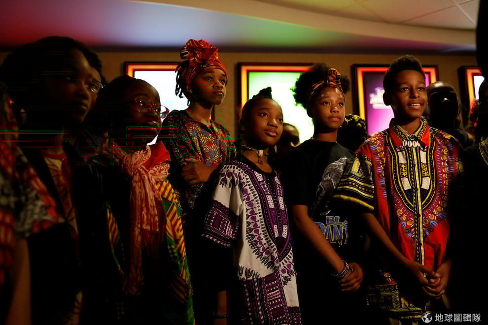 一群小學生穿著非洲傳統服飾,正在聽從老師指示。稍後他們整班就要一同欣賞《黑豹》了。