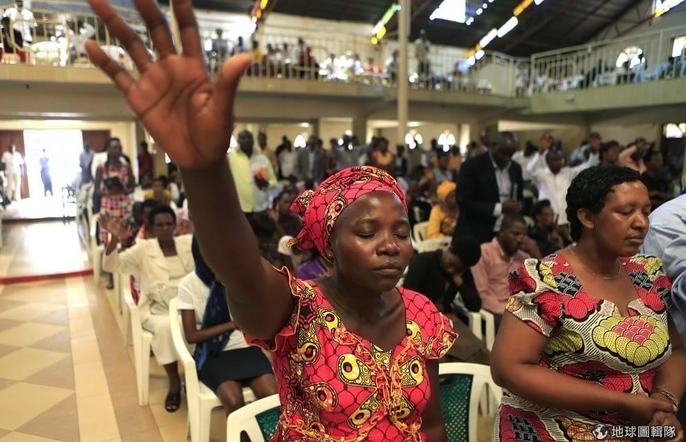 一名信徒在教堂內舉起手閉眼參加活動。近日,盧安達有大約 700間教堂被當局下令暫時關閉,引發社會對教堂建築安全的討論。