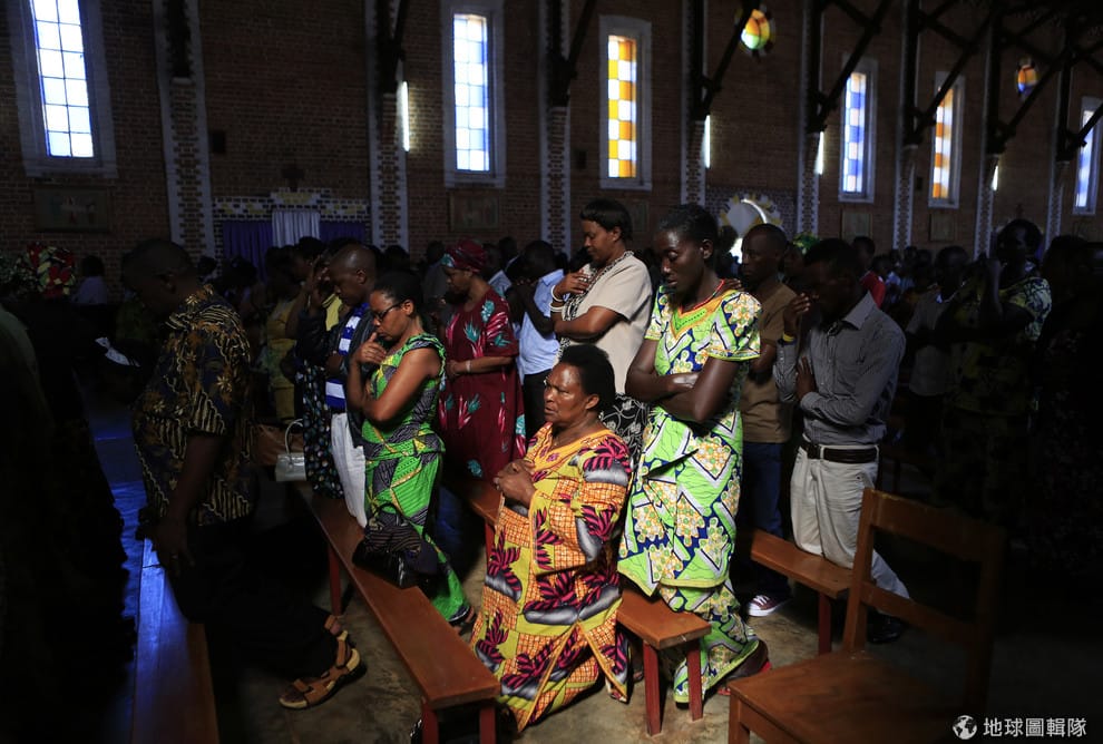 在盧安達一間天主教堂內,信眾們虔誠地跪下禱告。