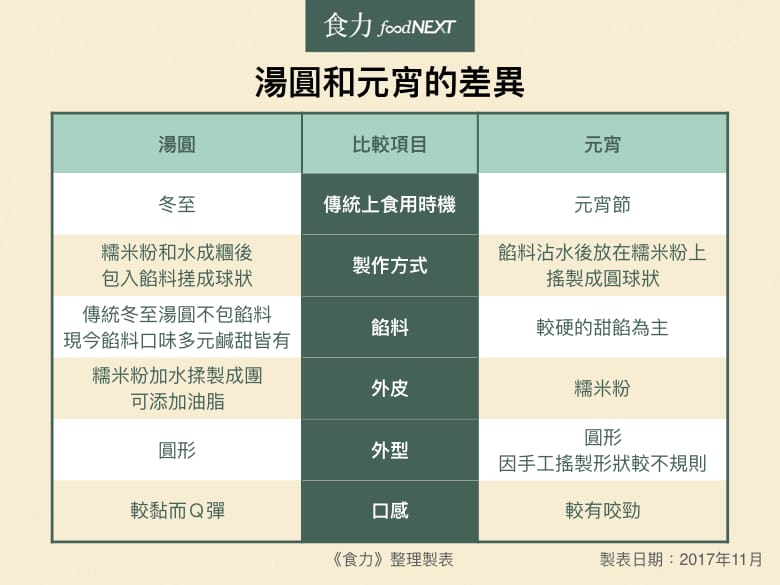 元宵節吃的元宵是用餡料沾水,在糯米粉中滾製而成。 而包餡湯圓則是先以糯米粉加水揉製糯米粉糰後,將餡料包入搓揉成球型。不過,早期台灣人吃的冬至湯圓,多半沒有包餡,而是粉糰染成紅色,做成紅白2色湯圓。