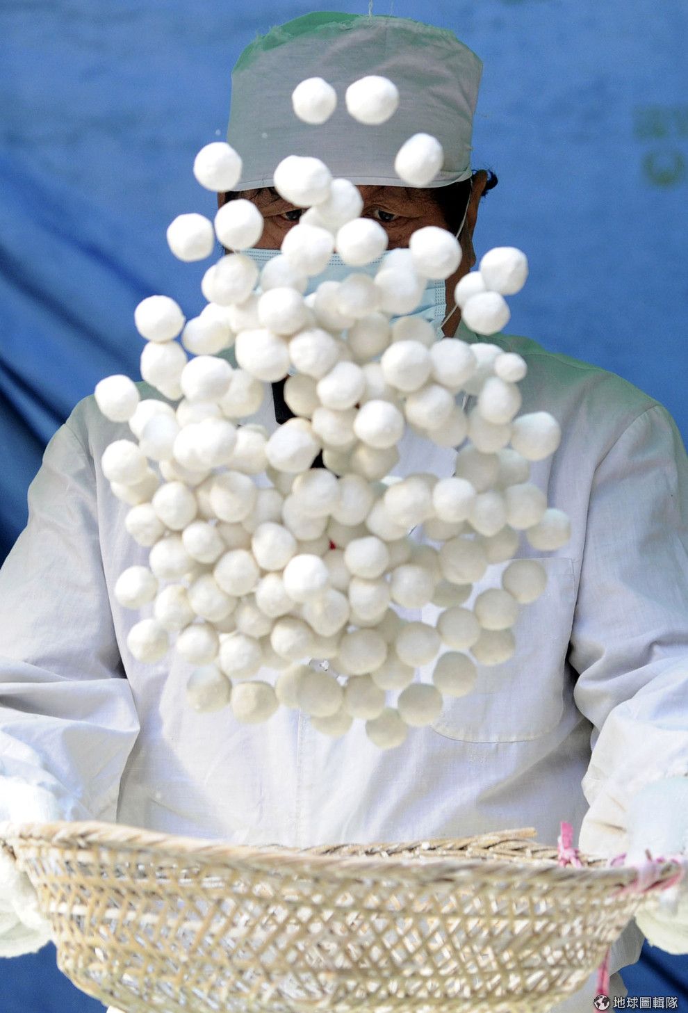 傳統元宵節吃的元宵,是用餡料沾水在裝有糯米粉的竹篩上搖製而成。(攝於大普美藝術蛋糕公司)