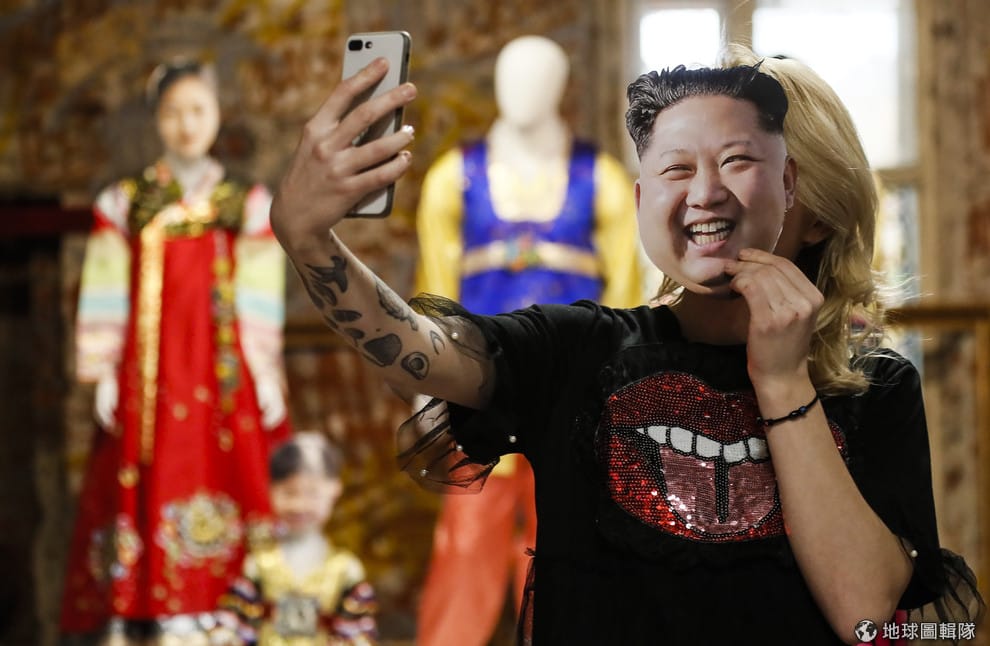今年一月,莫斯科UMAM博物館舉辦了「北韓製造」特展,一名工作人員舉起北韓領導人金正恩的面具,比在自己的臉上和身後的韓服留影。