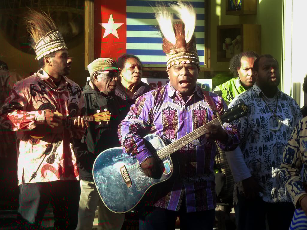 在一家新開的巴布亞商店前,店家發著傳單並述說著巴布亞人種族滅絕的故事。店門外的晨星旗是「自由巴布亞運動」的旗幟,該團體希望西巴布亞省可以從印尼獨立出來。