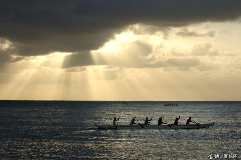 2006年,夏威夷的歐胡島(Oahu),人們在海上划著獨木舟。台灣有著最豐富的南島語系歧異度,在台灣以南的太平洋島嶼上都能見到南島語族的蹤影。