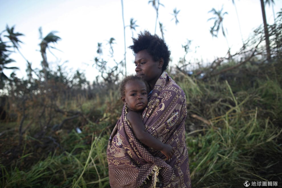 2015年3月18日,萬那杜的塔納島(Tanna)一名婦女抱著小孩走著,身旁的樹都因熱帶氣旋帕姆摧毀殆盡。