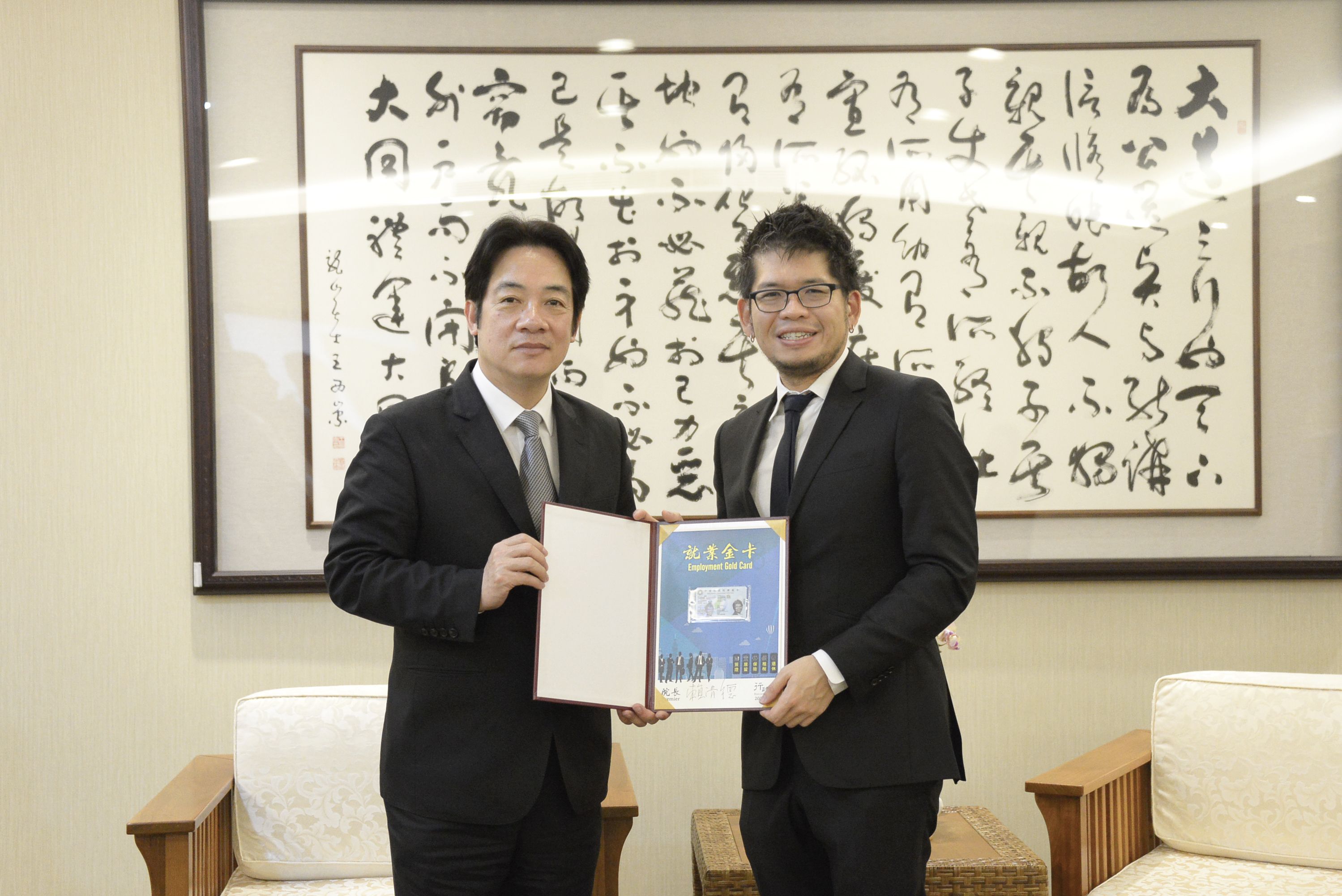 網友國家發展委員會隨著《外國人才專法》上路,我國第一張「就業金卡」由行政院長賴清德(圖左)頒給了YouTube共同創辦人陳士駿(Steve Chen,圖右)。