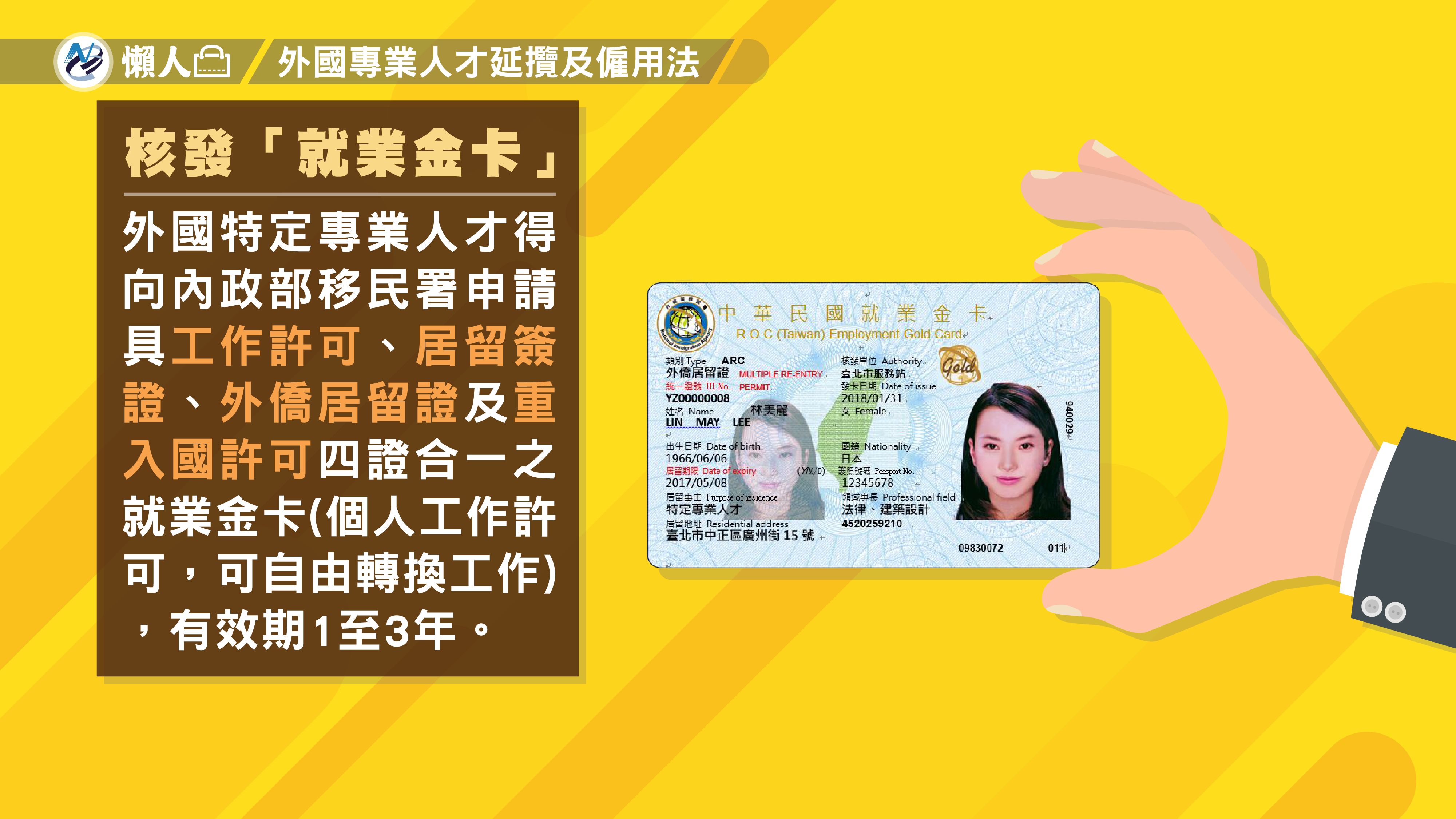 而在一系列提供給外國特定專業人才的優惠措施中,最值得注意的就是「就業金卡」。這張「就業金卡」結合了:工作許可證、居留簽證、外僑居留證和重入國許可證,四證合一讓工作和生活更方便,且申請者只要統一上網向內政部移民署申請即可,有效期一到三年。