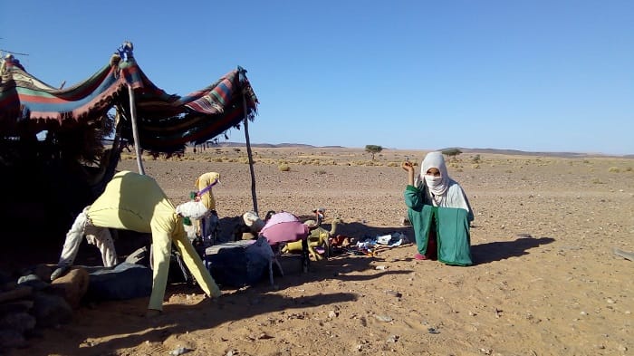我與摩洛哥夫婿貝桑居住在極為觀光化的撒哈拉聚落Merzouga,鄰近居民無一不是因乾旱而走入觀光產業的遊牧民族後裔,尚有些仍在偏遠處搭帳篷,維持游牧型態。雖已非傳統的逐水草而居,遷徙頻率相對高,堪稱當地最弱勢貧困的一群,偶爾可在沙漠深處與他們不期而遇。