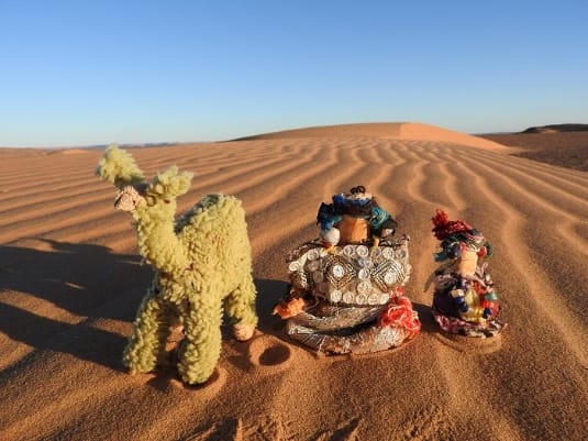 驅車馳騁撒哈拉,佈滿碎石的曠野地上,遠遠卻見一座迷你小帳篷,我們下車一看,以彎曲樹枝與破舊地毯撐起的小帳篷前方,擺置了些撒哈拉特有化石、手工娃娃與布駱駝等,裡面全是賣給觀光客的紀念品。然而物件賣相不佳,布料老舊,做法粗糙,真不知這些貨品究竟可賣給誰?也讓我愈發好奇這「店家」會是什麼樣的人物?