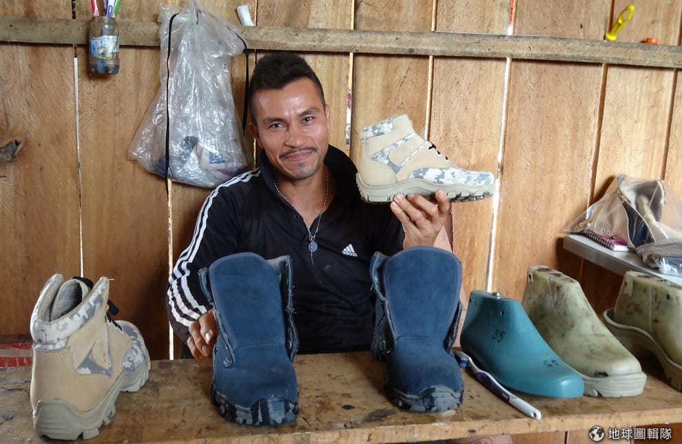 一名前FARC成員拿著自己做的鞋子,開心地在鏡頭前留影。對他們來說,作戰已經不再是生活的一部分。