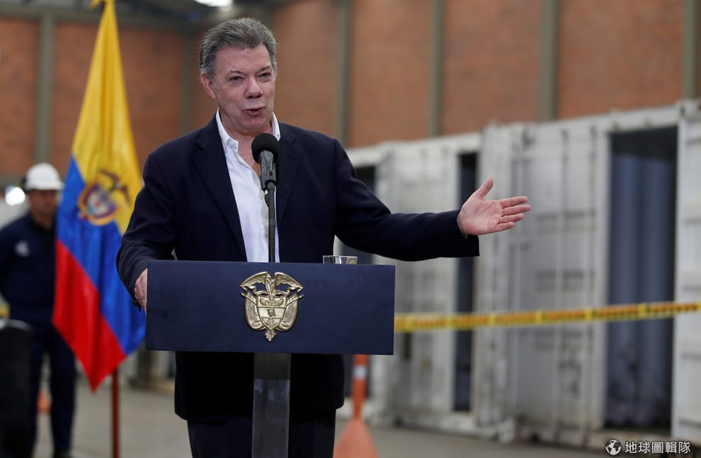 圖為哥倫比亞總統桑多斯,他的身後是FARC解散後上繳的武器,數量之多以貨櫃來計算。