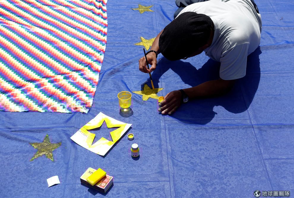 路透社一名學生在活動前趕工,他正在幫這面號稱世界上最長的旗子畫上黃色星星。