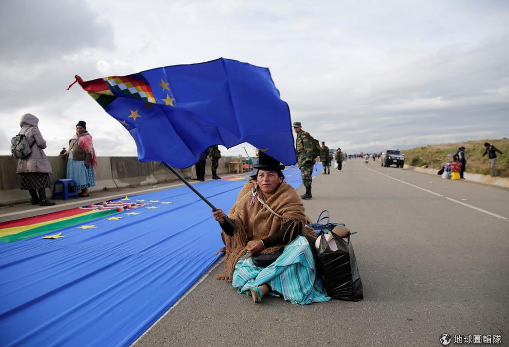 玻利維亞沿著高速公路打造了一面近 200公里長的旗子。圖為 10號的活動上,這面旗子從空中拍下的樣子。