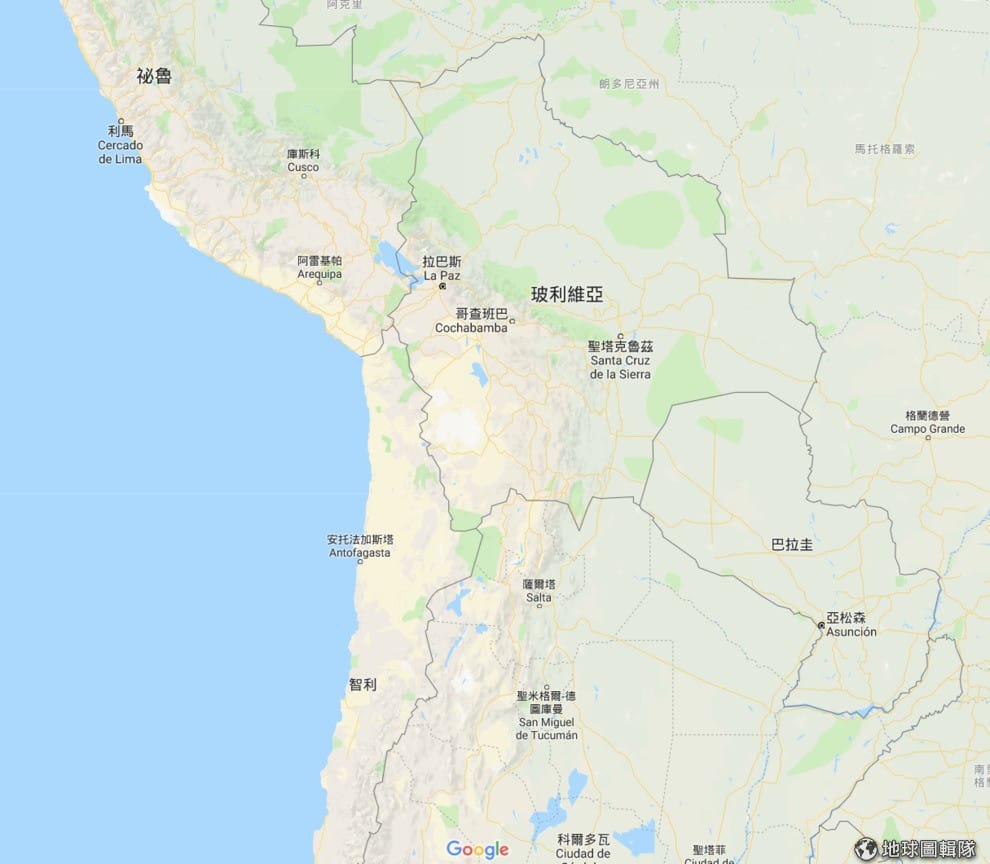 圖為玻利維亞和智利的國界。在 19世紀的太平洋戰爭中,玻利維亞割讓沿太平洋岸的領土給智利,使得玻利維亞自此成為一個內陸國。