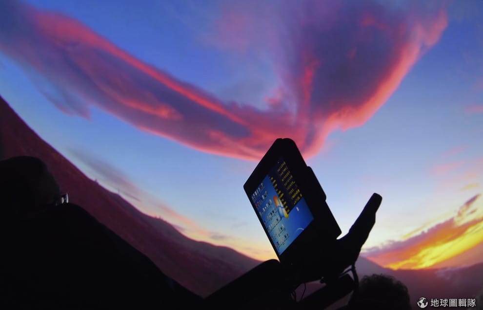 在這張 2015年12月的照片中,霍金的螢幕與背後的彩霞相互照應著。