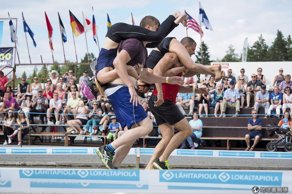 芬蘭人的國民生產毛額雖然不是全球第一,但他們很會把財富轉為幸福,也願意繳重稅當作對生活品質的投資。圖為參加芬蘭揹老婆大賽一景。