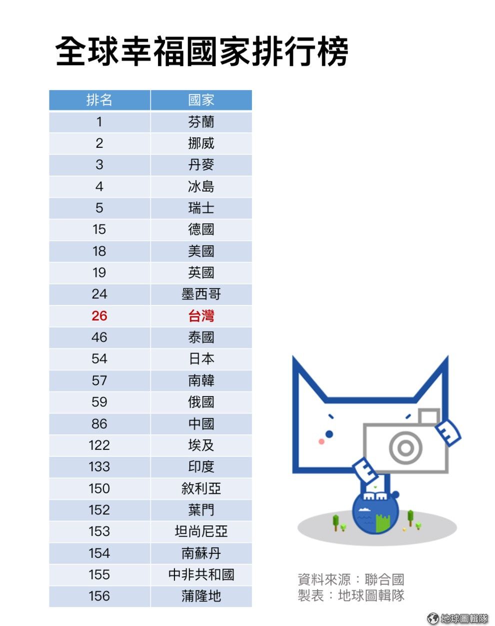 從今年的《全球幸福國家》報告中可以發現,在 156個國家中,台灣位居第 26名,是東亞最幸福的國家。