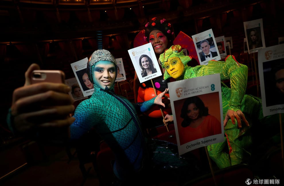 圖為 2018年2月,在英國皇家阿爾伯特音樂廳,太陽馬戲團為即將到來的英國影藝學院獎(British Academy of Film and Television Arts Awards)佈置座位,劇團成員們正在和英國影藝學院獎嘉賓的座位牌合照。